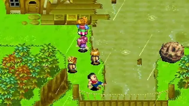Continua por el único camino posible hasta ver a un grupo de gente que observa como un chico ha caído al rio. Desesperados, te piden ayuda para ir a buscar a más gente e intentar salvar al chico. Dirígete hacia el sur para cruzar el puente y llegarás a la plaza del pueblo. Habla con la chica, Nadia, para que se una al grupo y regresa donde estaba el chico en el agua. Al llegar al puente verás como una enorme roca cae sobre los habitantes que allí se encuentran y verás como los padres de Nadia, su hermano Félix y el propio padre de Hans desaparecen de la escena.